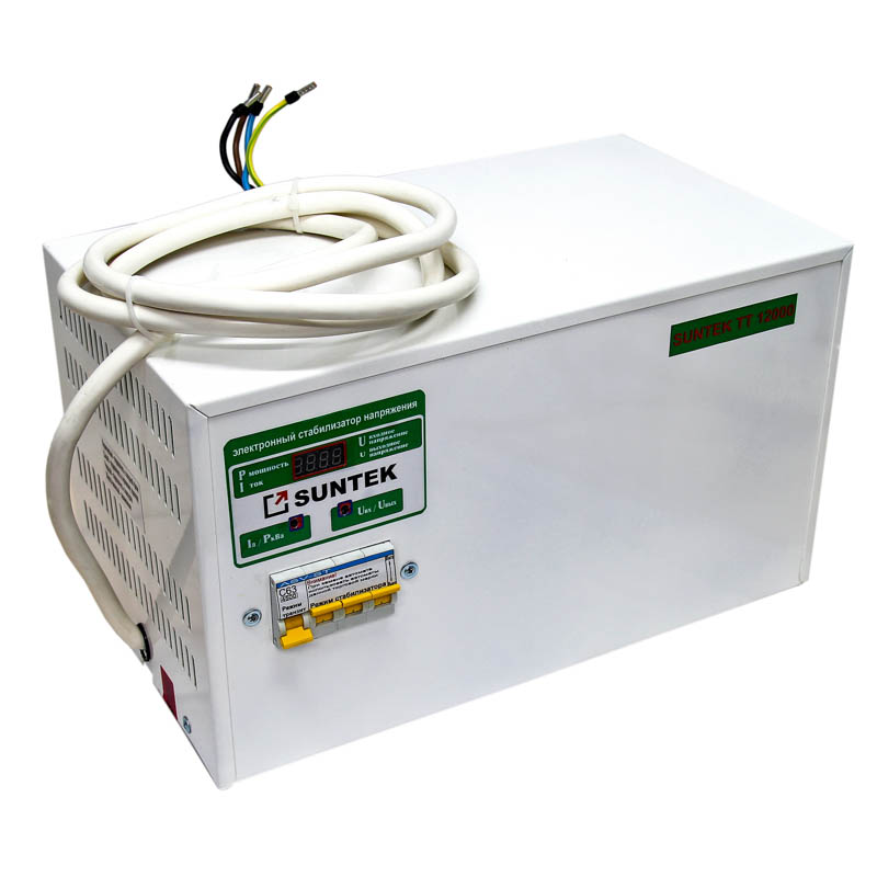 - Отличается от однофазного стабилизатора напряжения тиристорного типа SUNTEK 10000ВА большей мощностью (более мощной катушкой), силовыми ключами. Служит для стабилизации напряжения в сети питания оборудования и техники мощностью до 12000ВА (12кВА).