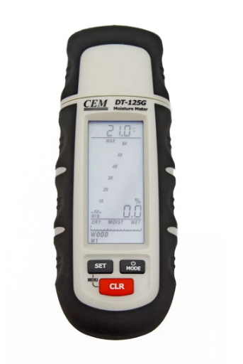 - Влагомер DT-125G — измеряет процент влажности в древесине (19 видов) и строительных материалах (121 вид). В комплектации предусмотрены щупы разной формы, поэтому устройство может изучить сыпучее сырье, цементные растворы. Вычислит процент влажности в окружающей среде.
