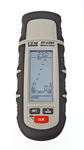 - Влагомер DT-125H — устройство, которое определяет процент влажности в древесине, строительных материалах. Помимо этого, измеряет параметры окружающей среды: температуру и влажность.