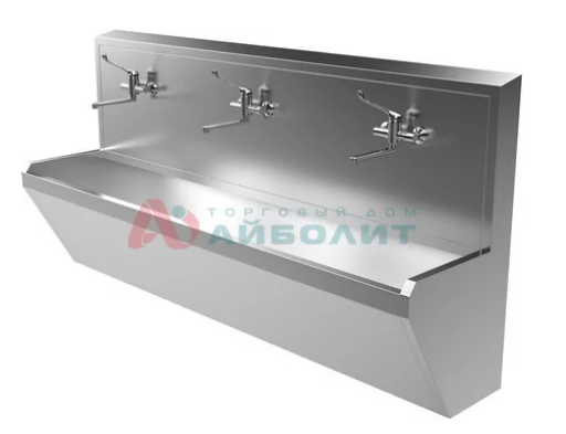 - Умывальник (мойка хирургическая) на три места изготовлен из нержавеющей стали AISI 304. Особая форма и большой размер чаши препятствуют образованию брызг и позволяют комфортно вымыть руки выше локтей.