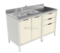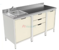 Длинный стол, в основе которого 3 тумбы: 1-я имеют по 4 ящика, 2-я и 3-я тумбы с дверцей и одним ящиком. Каркас выполнен из алюминия. Конструкционное заполнение - химически стойкий пластик. Габариты: (ШхГхВ) 2700x600x850 мм