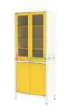 Две двустворчатые секции. В верхней дверцы из стекла в рамке из анодированного алюминиевого сплава и три регулируемые стеклянные полки. В нижней секции - запирающиеся дверцы и полка из стали. Шкаф установлен на регулируемые ножки. Габариты (ШxГxВ) 800x400x1900.