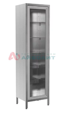 - Выполнен из нержавеющей стали толщиной 0,8 мм. Сварная конструкция. Установлен на регулируемые ножки. Одна секция с высокой дверцей из стекла в рамке из анодированного алюминиевого сплава и пятью регулируемыми стеклянными полками. Конструктивной особенностью шкафа является отсутствие труднодоступных полостей для дезинфекции.