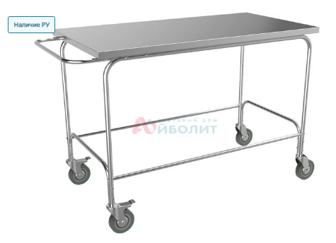 - Столешница: нержавеющая сталь AISI 304. Каркас: стальная труба круглого сечения с полимерно-порошковым покрытием "металлик". Колеса Ø125 мм самоориентирующиеся с резиновым периметром, два с тормозом в том числе. Поставляется в разобранном виде.