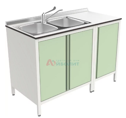 - Мойка состоит из тумб, столешницы из пластика толщиной 14 мм и мойки 2-х чашевой.