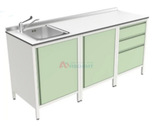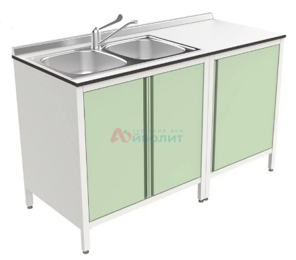 - Мойка состоит из тумб, столешницы из пластика толщиной 14 мм и мойки 2-х чашевой.
