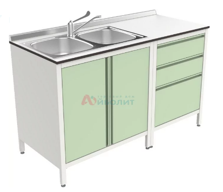 - Мойка состоит из тумб, столешницы из пластика толщиной 14 мм и мойки 2-х чашевой.