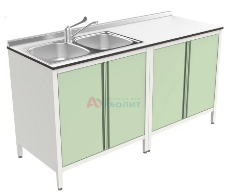 - Мойка состоит из тумб, столешницы из пластика толщиной 14 мм и мойки 2-х чашевой.