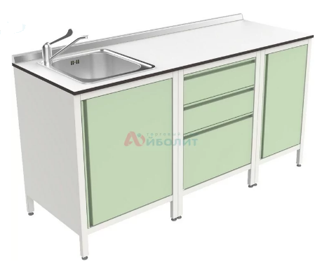 - Мойка состоит из тумб, столешницы из пластика толщиной 14 мм и мойки 1-но чашевой.