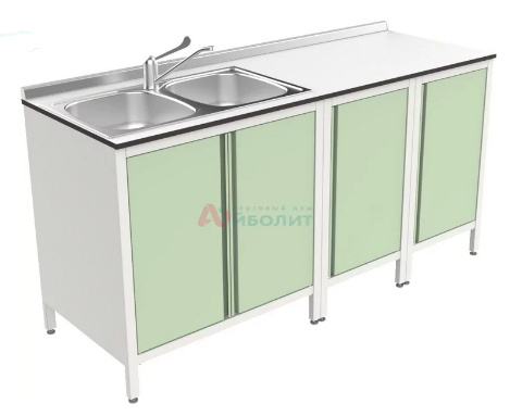 - Мойка состоит из тумб, столешницы из пластика толщиной 14 мм и мойки 2-х чашевой.