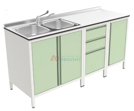 - Мойка состоит из тумб, столешницы из пластика толщиной 14 мм и мойки 2-х чашевой.