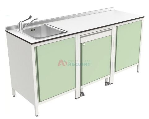 - Мойка состоит из тумб, подкатной тумбы, столешницы из пластика толщиной 14 мм и мойки 1-но чашевой.