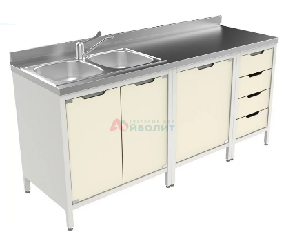 - Мойка состоит из тумб, столешницы из нержавеющей стали и мойки 2-х чашевой.
