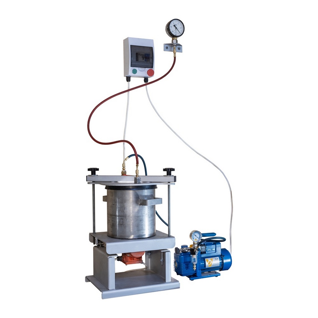 - Изделие включает в себя металлическую чашу с крышкой с прозрачным окошком к которой подключён через фильтр вакуумный насос с вакуумметром. Чаша установлена на вибростол.